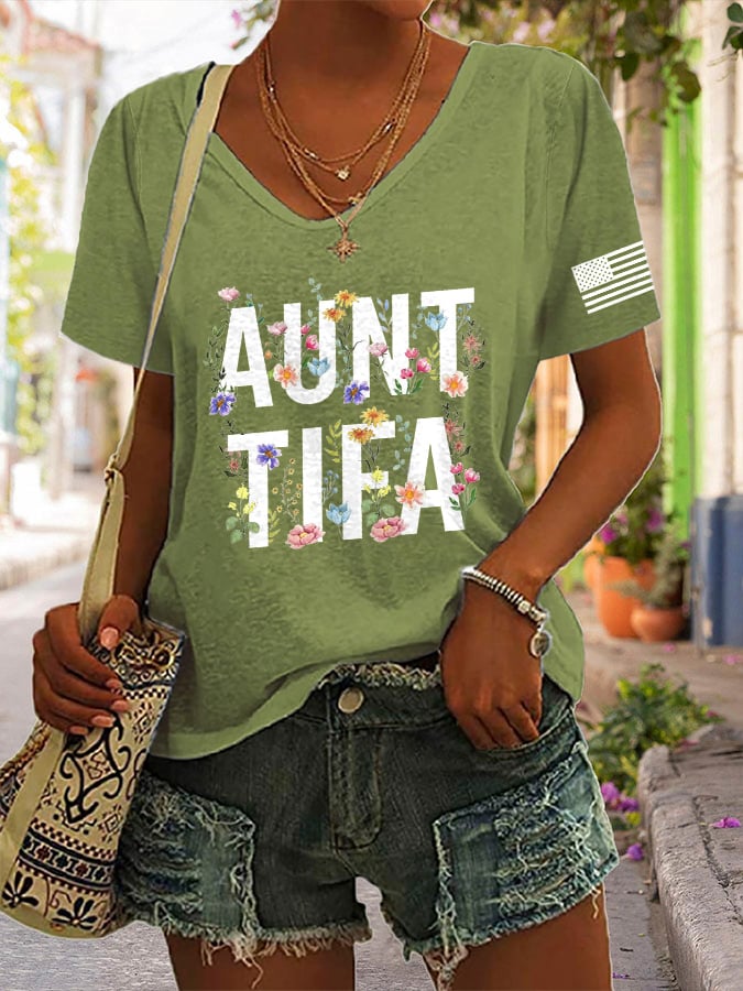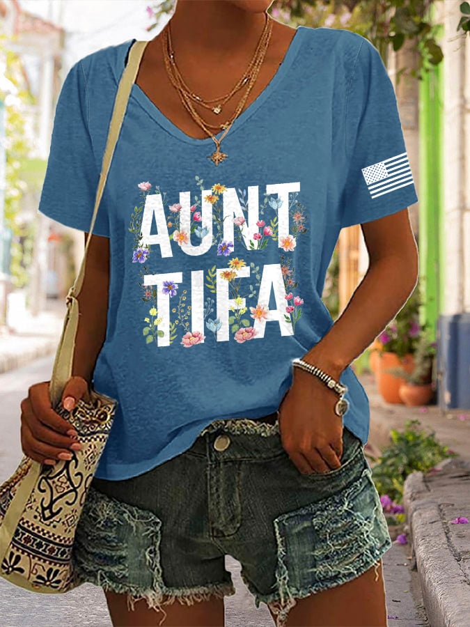 V-Neck Retro I Am Aunt Tifa Print T-Shirt