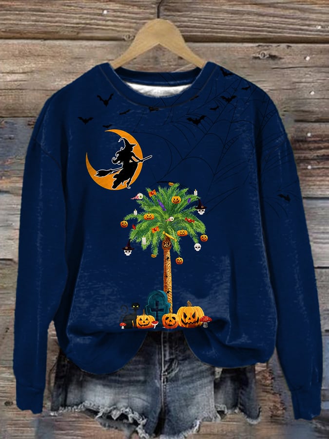 Women's Pumpkins Palm Tree Printed Crew Neck Sweatshirt